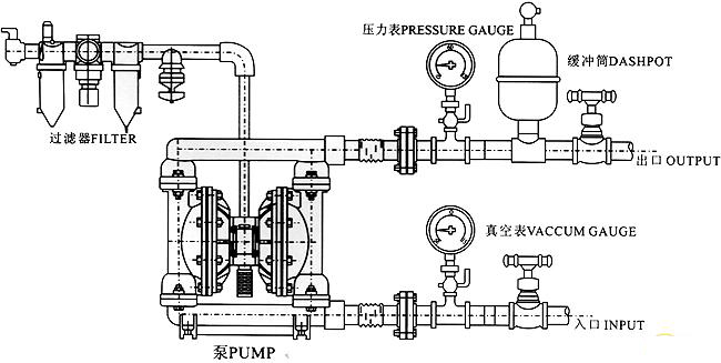 注:在使用QBK氣動隔膜泵是,要安裝空氣過濾器,以濾去壓縮空氣中的水分,并在泵的出口安裝壓力表,避免壓力過高損害泵,在泵不工作時應(yīng)及時清洗泵,避免因凝固損壞泵。